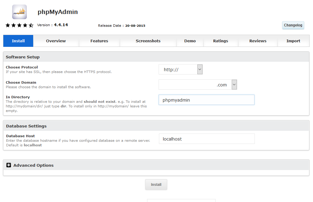 3. Click on the "Install" button. You will need to choose your domain name and folder to install to. You will want to differentiate your folder name so that it doesn't conflict with the current install. After that, confirm the installation by hitting the "Install" button again.